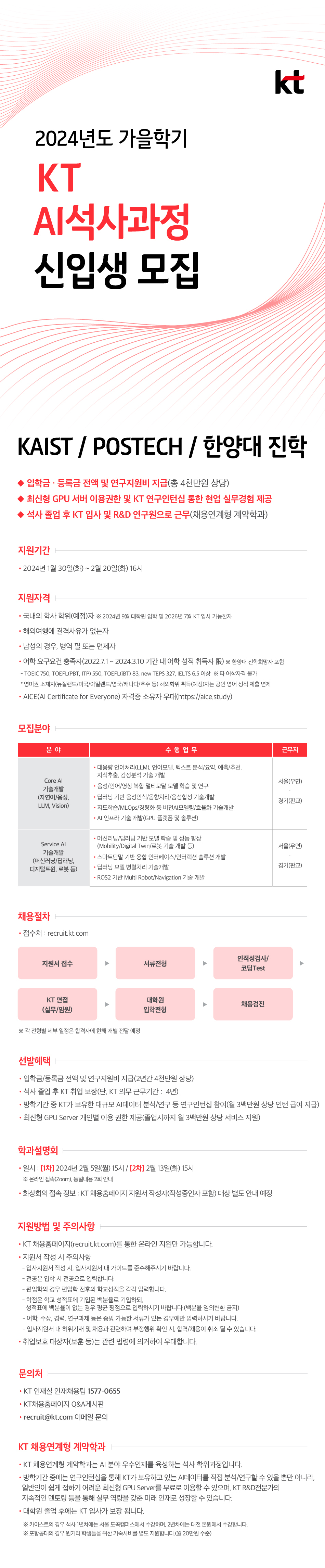 2024년도 가을학기 KT AI석사과정(계약학과) 신입생을 모집하오니,