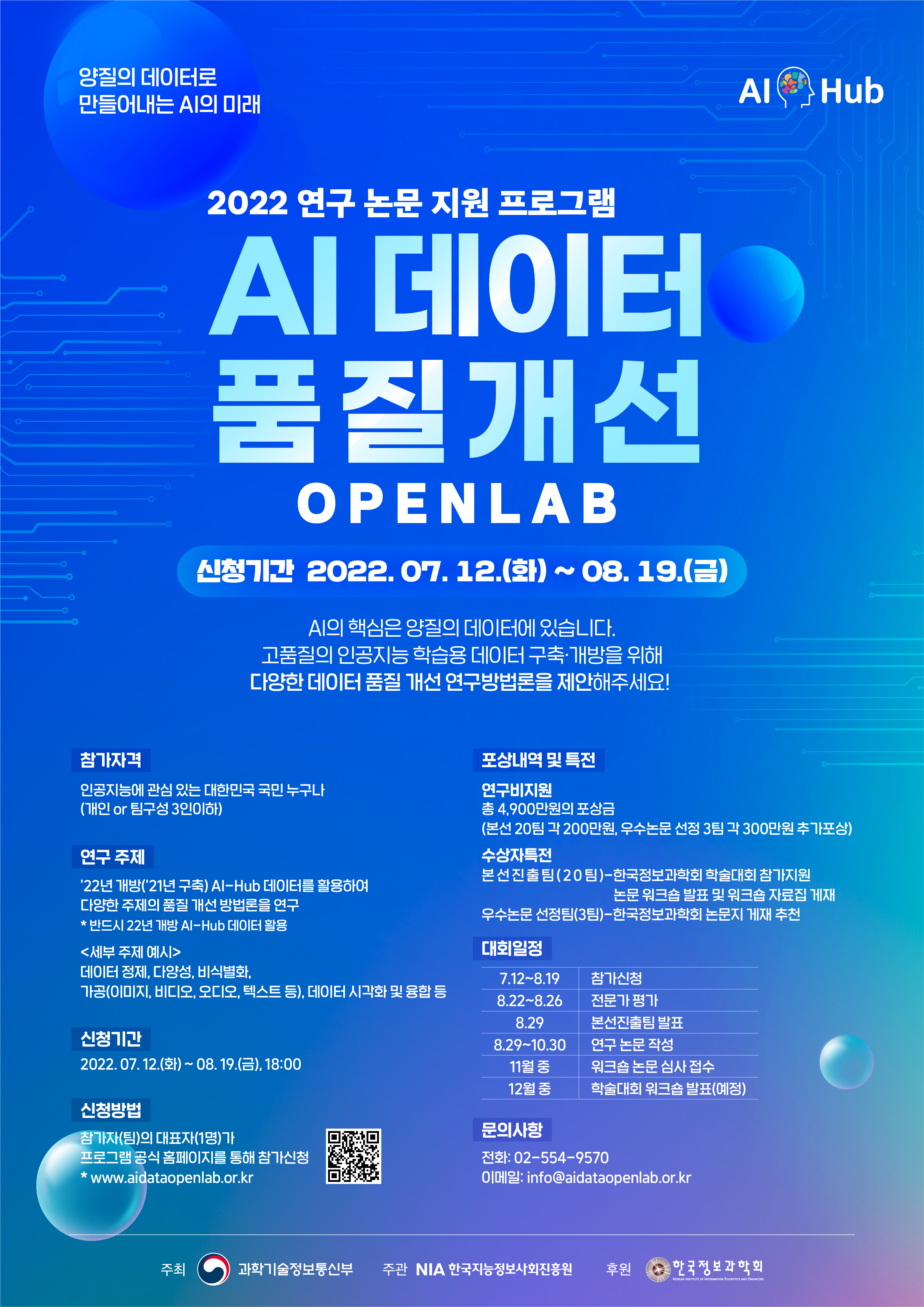 | [2022 연구 논문 지원 프로그램] AI 데이터 품질개선 OPENLAB 프로그램 안내 | ||