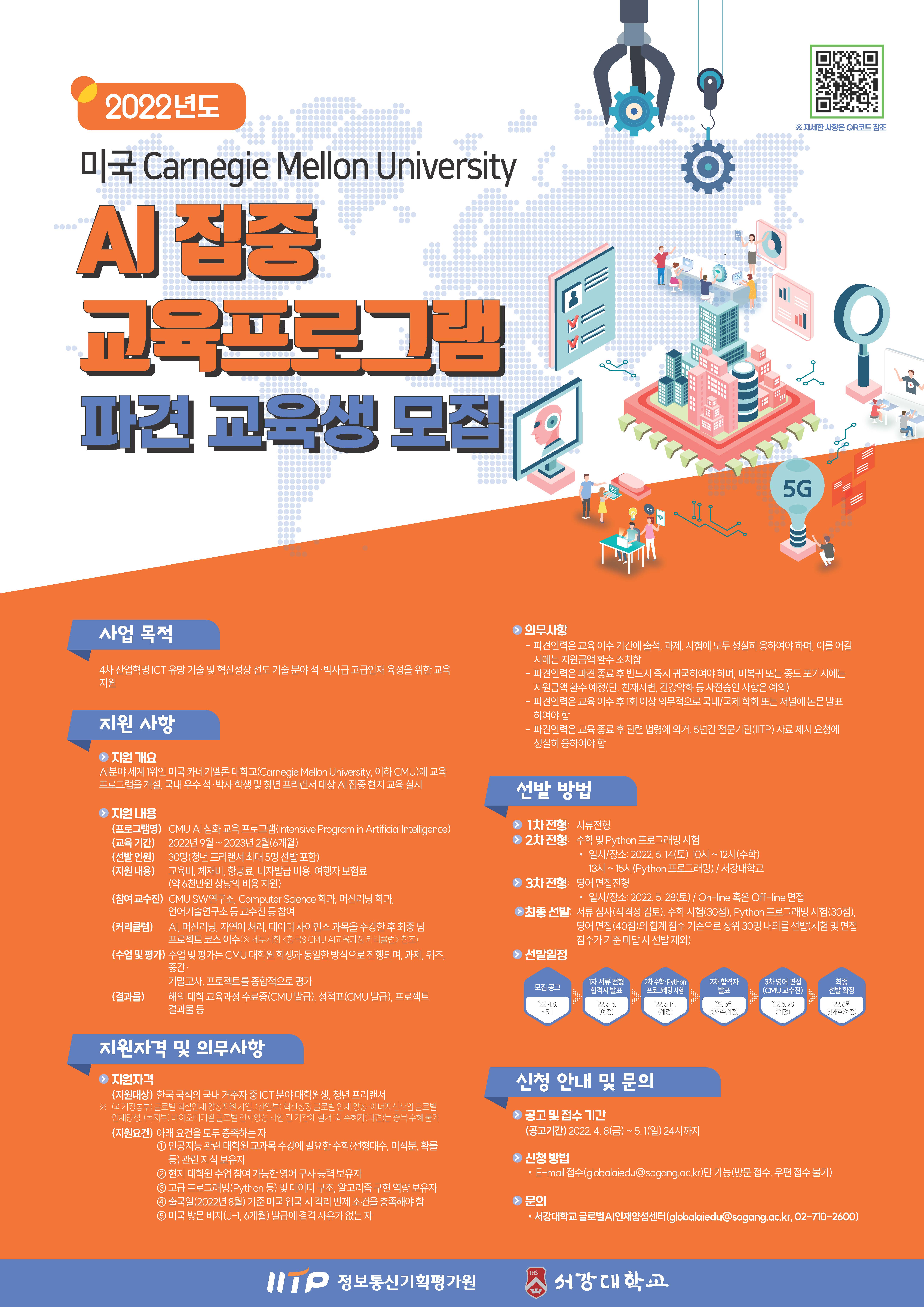 정보통신기획평가원 및 서강대학교 글로벌AI인재양성사업단에서는 4차 산업혁명 ICT 유망 기술 및 혁신성장 선도 기술 분야 석·박사급 고급인재 육성을 위해 2022년도 프로젝트형 글로벌 역량강화 사업의 하반기 CMU AI 교육과정 파견 교육생 선발 계획을 공고하오니, 참여를 희망하는 석·박사과정 대학원 학생 및 청년 프리랜서는 첨부된 파일을 참고하여 관련절차에 따라 신청하여 주시기 바랍니다.