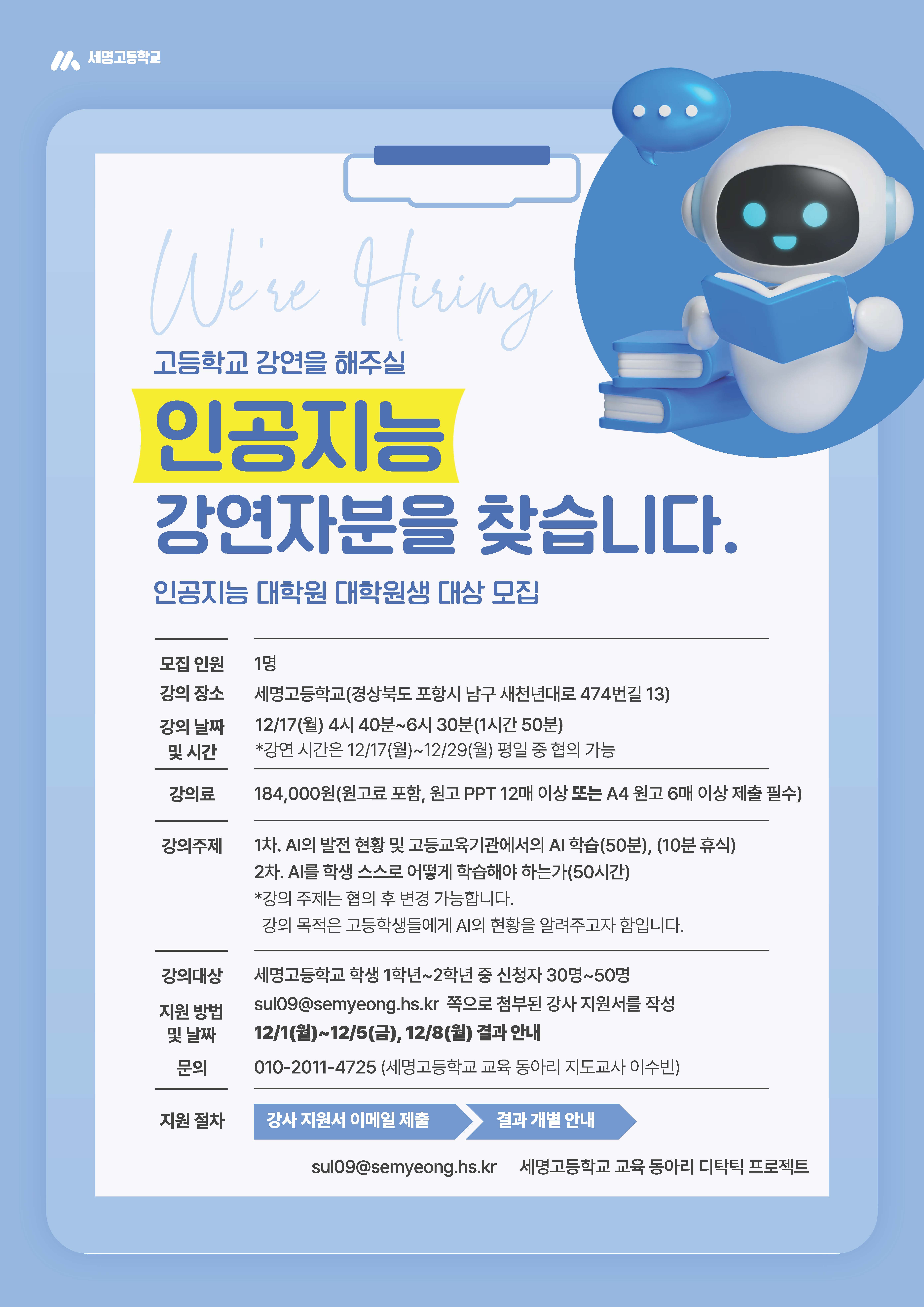 | [세명고등학교] AI 강연 강사 모집 | ||