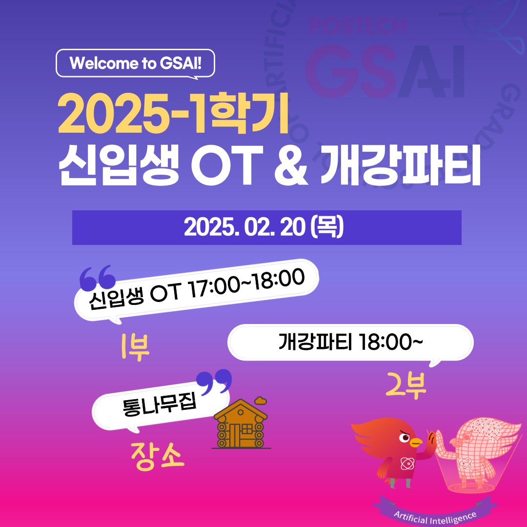 POSTECH 인공지능대학원에서는 2025-1학기 신입생 오리엔테이션 및 개강파티를 아래와 같이 개최합니다.