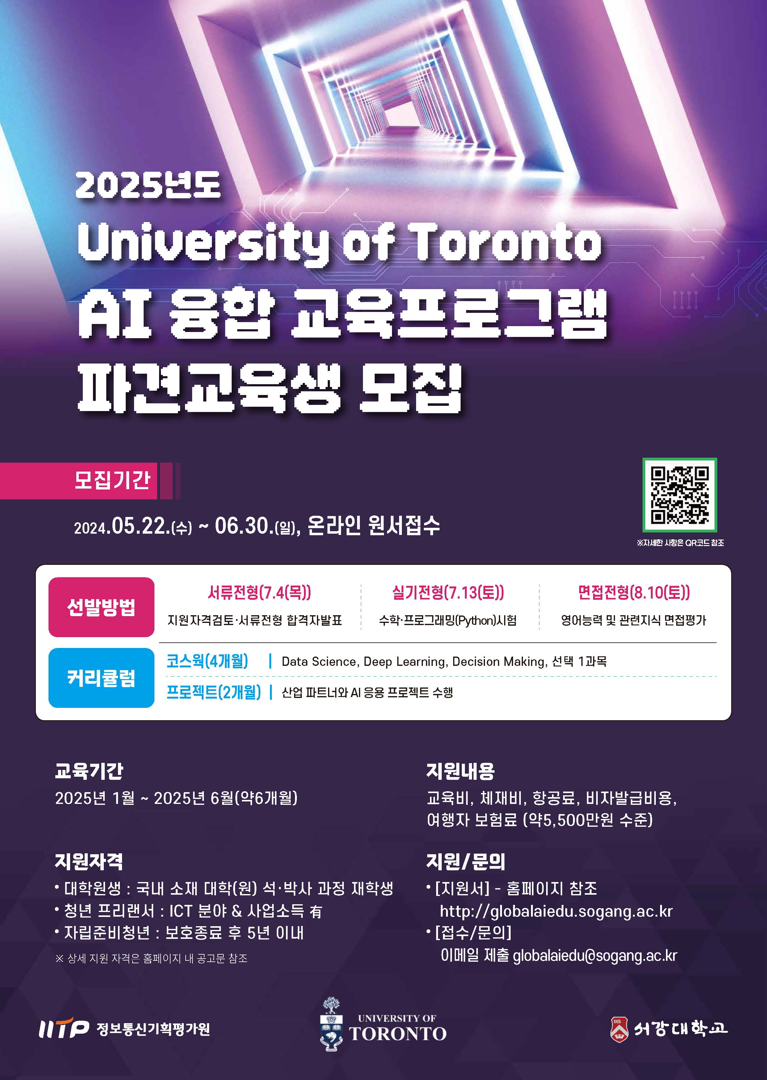 | [서강대학교] 2025 University of Toronto AI 융합 교육프로그램 파견 교육생 모집 | ||