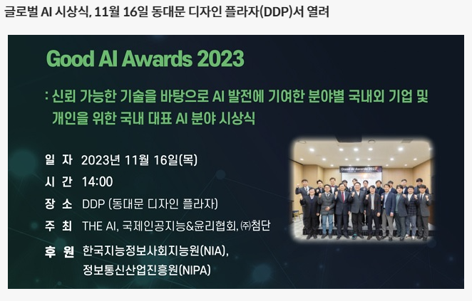 이번 시상식은 11월 16일부터 양일간 열리는 AI 전시회 ‘TAS(THE AI SHOW)’의 부대행사로 마련됐다. 시상식은 전시회 개막식 이후 진행돼 정부, 학계, 기관, 기업 등 다양한 AI 관계자가 참석할 것으로 전망된다. 지난 시상식에선 기업 부문으로 LG AI연구원이 대상을, KB국민은행이 최우수상을, 포티투마루와 온코크로스가 우수상을 받았고, 문정욱 정보통신정책연구원 지능정보사회정책센터장, 김명주 서울여대 바른AI연구센터장, 이찬규 중앙대 인문콘텐츠연구소장, 김대원 카카오 인권과기술윤리팀장 등이 개인상을 받았다.