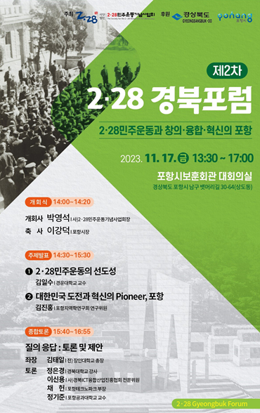 발표 주제는 ‘2·28민주운동의 선도성’과 ‘대한민국 도전과 혁신의 Pioneer, 포항’이다.