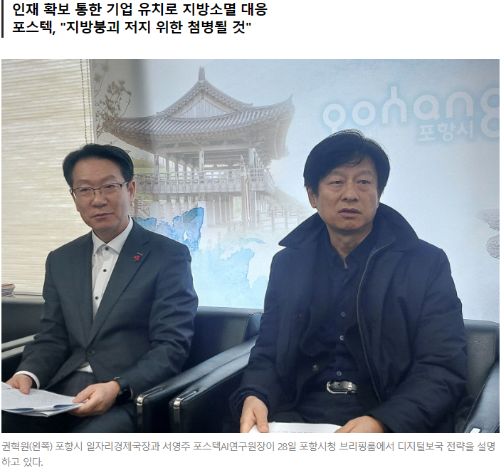 28일 포항시청 브리핑룸에서 열린 기자회견에서 권혁원 포항시 일자리경제국장과 서영주 포스텍AI연구원장은 도시와 대학이 지방소멸에 대한 전략을 함께 공유하며 공동으로 힘을 모아나가겠다고 밝혔다.