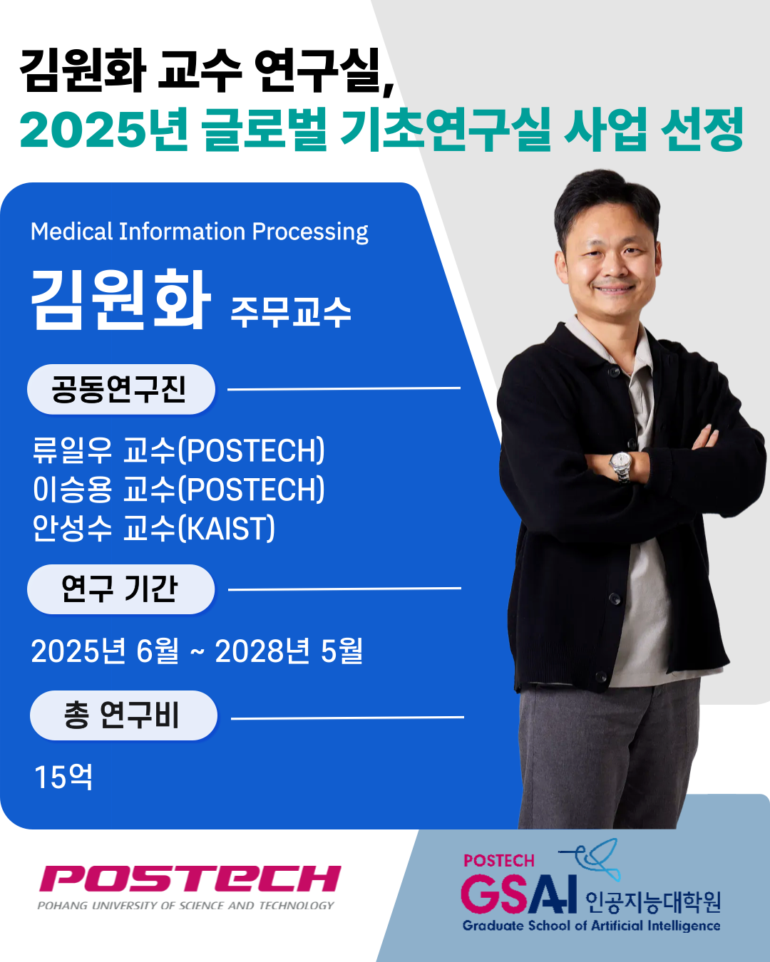 과학기술정보통신부와 한국연구재단이 주관하는 ‘2025년 글로벌 기초연구실 사업’에 인공지능대학원 김원화 교수와 공동 연구진이 선정돼 총 15억원의 연구비를 지원받게 됐다.