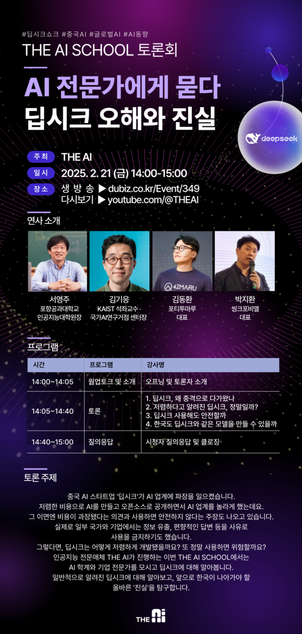 이번 THE AI SCHOOL에서는 실제 AI를 연구하고 언어모델을 만들고 신뢰성을 탐구하는 학자와 기업 대표들이 나와 관련 내용을 논의할 예정이다. 황민수 THE AI 대표는 “새로운 기술이 나올 때마다 다양한 플랫폼에서 진실과 거짓이 섞인 이야기가 나와 정보 오류가 발생하고 있다”며 “딥시크 역시 산재한 정보들이 많아 올바른 내용을 파악하기 힘든 분들을 위해 진짜 AI 전문가들의 이야기를 통해 딥시크를 알아보는 프로그램을 기획하게 됐다”고 말했다.