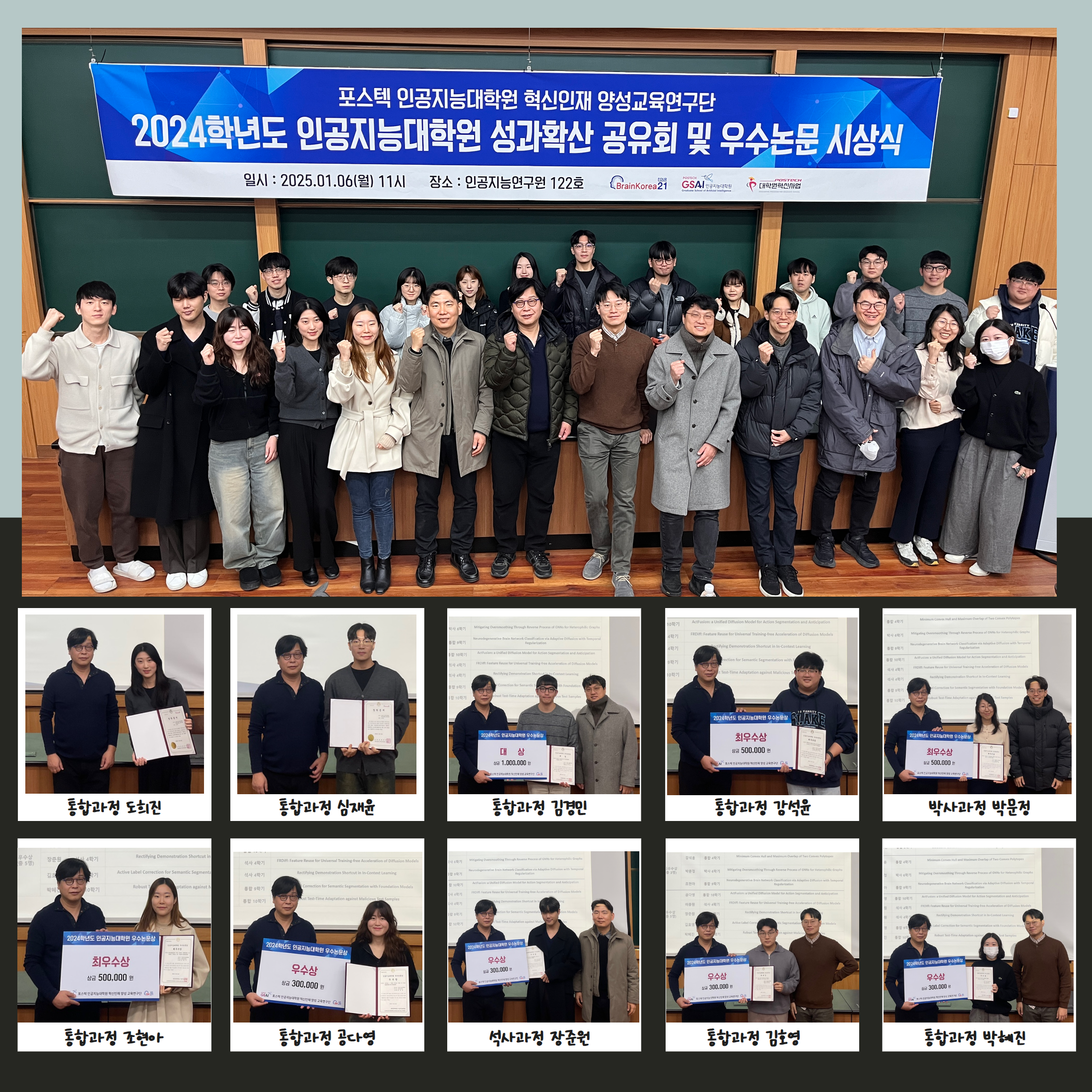 POSTECH 인공지능대학원은 2025년 1월 6일 “2024학년도 인공지능대학원 성과확산 공유회”를 개최하여 우수한 연구 성과를 공유하고 학문적 발전을 축하하는 시간을 가졌습니다.