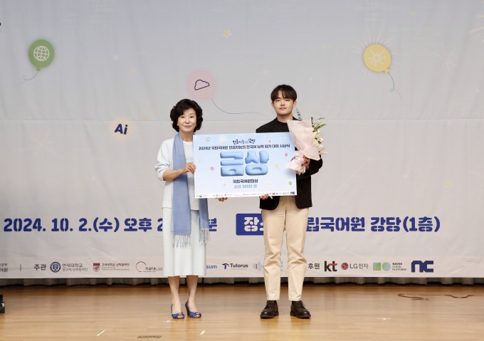 '2024년 인공지능의 한국어 능력 평가 경진대회' 시상식에서 장소원 국립국어원장(왼쪽)이 금상을 수상한 이동건 포스텍 석사과정생(오른쪽)과 기념 촬영하고 있다. 포스텍 제공