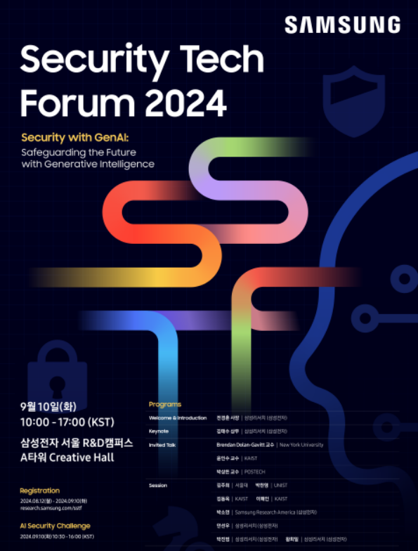 올해 8회째를 맞은 이번 '삼성 보안 기술 포럼'은 '생성형 AI와 함께하는 보안: 생성형 지능과 함께 안전한 미래로(Security with GenAI: Safeguarding the Future with Generative Intelligence)'라는 주제로 진행된다.
