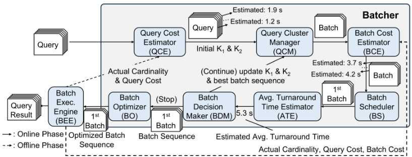 포스텍 연구진이 개발한 Batcher는 소형 질의들을 무작위로 합치지 않고, 질의 처리 시간과 실행 계획의 DAG 구조를 함께 고려해 최적의 배치를 구성하는 지능형 배치 기술이다. Batcher는 먼저 질의별 실행 비용을 예측하고, 이후 질의 실행 시간과 DAG 기반 실행 구조의 유사성을 기준으로 질의들을 2단계로 군집화한다. 이어 반복적 개선(iterative refinement)을 통해 평균 turnaround time을 최소화하는 배치 구성을 찾고, 배치별 비용 추정과 비용 기반 배치 스케줄링으로 처리 순서를 정한다. 또한 배치 내부에서는 공통 서브쿼리 결과를 재사용하여 중복 연산을 줄임으로써 추가 성능 향상을 달성한다. 이 과정에서 배치 비용 추정에 경량 MLP 모델을 적용하고, 증분형 군집 갱신 기법을 활용해 높은 질의 유입 환경에서도 낮은 오버헤드로 의사결정을 수행할 수 있도록 설계한 것이 핵심이다.