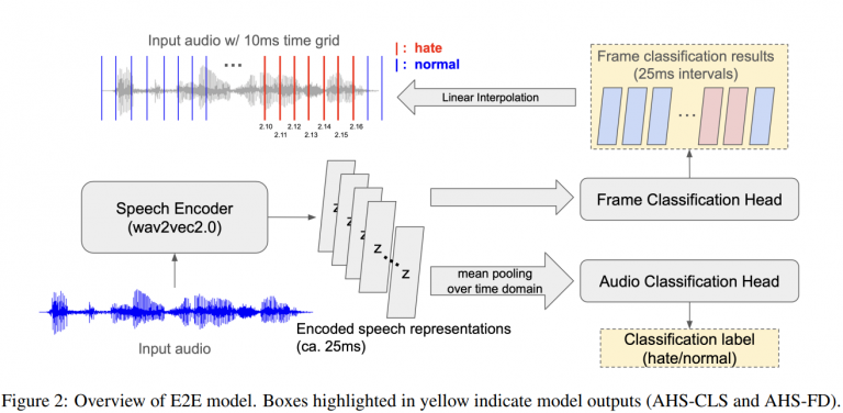 이 테스크를 수행하기 위해 크게 2가지를 진행했습니다. 첫째로 설명가능한 증오표현 오디오 데이터셋을 최초로 제작했습니다. TTS(Text-To-Speech) 또는 실제 사람의 육성을 기반으로 한 오디오 데이터셋을 구축하고, 해당 오디오에서 증오표현이 어떤 시간 구간에서 발생하는지 annotation을 진행했습니다. 두번째로 설명가능한 증오표현 탐지 모델을 제안했습니다. 이 모델은 오디오를 input으로 받고 전체 오디오가 증오표현이 포함되었다고 판단되었을 때, 어떤 시간구간이 증오표현이 포함되었는지 알려주는 모델입니다. 모델은 오디오를 End-to-End(E2E)로 사용하는 방식, 오디오를 텍스트로 바꿔서 사용하는 Cascading 방식으로 2가지 종류가 있습니다.