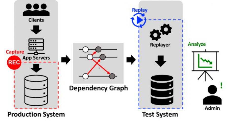 데이터베이스 재생 시스템은 프로덕션 환경에서 데이터베이스 워크로드를 수집하고 테스트 환경에서 재생해, 소프트웨어 및 하드웨어 변경에 따른 성능 변화와 버그를 프로덕션 시스템에 영향 없이 검사한다. 데이터베이스 재생 시스템은 워크로드 내 각 요청(request)의 재생이 수집 시와 동일한 결과를 내도록 보장하기 위해 의존성 그래프(dependency graph)를 생성하는데, 이 그래프는 각 요청을 정점으로, 의존성이 있는 두 요청 간의 선후 관계를 간선으로 나타낸다. 그러나 기존의 방법은 각 요청마다 다른 요청들을 탐색하여 간선들을 생성하는데, 최악의 경우 워크로드 내 요청 수의 제곱에 비례하는 시간을 소모하여, 워크로드 수집에서 재생으로 이어지는 전체 과정에서 병목을 유발한다. 또한, 이렇게 생성되는 간선의 대다수는 중복 간선(redundant edge; 제거하더라도 다른 경로에 의해 선후 관계가 지켜지는 간선)이기 때문에, 워크로드 재생 전 이들을 제거하는 값비싼 전이적 축소(transitive reduction) 과정의 비용을 증가시킨다. 따라서 시간에 따라 변화하는 워크로드를 지속적으로 수집하고 신속하게 재생하여 테스트하기 위해서는, 중복 간선이 적은 간결한 의존성 그래프를 효율적으로 생성할 필요가 있다.