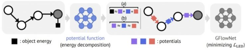 본 연구는 Learning Energy Decomposition for Partial Inference in GFlowNets (LED-GFN)이라는 이름의 에너지 분해 기반의 GFlowNet 학습 방법을 제안한다. 핵심 아이디어는 최종 상태 특성 (에너지)를 각 action에 따른 상태 전이와 관련된 학습 가능한 potential의 합으로 분해하여 로컬 크레딧으로 사용하는 것이다. 특히, 각 potential이 최종 상태와의 상관 관계를 잘 반영할 수 있도록 하는 정규화 방법을 적용하여 훈련한다. 이러한 potential은 중간 action이 최종 특성에 어떻게 영향을 미치는지에 대한 훈련 신호로서 credit assignment를 개선한다.