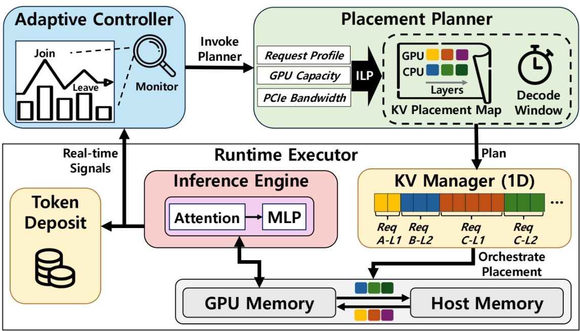 본 연구팀은 긴 문맥 LLM 서빙을 위한 세밀하고 적응적인 KV 캐시 관리 시스템인 OrbitFlow를 개발하였다. OrbitFlow의 핵심은 기존의 레이어(Layer) 단위가 아닌, 각 사용자 요청(Request) 단위로 KV 캐시의 위치(GPU 또는 CPU)를 결정하는 '세밀한(Fine-grained) 오프로딩 전략'에 있다. 연구팀은 경량화된 정수 선형 계획법(ILP) 솔버를 도입하여, 현재 처리 중인 모든 요청의 상태와 남은 GPU 메모리, 통신 대역폭을 고려해 최적의 캐시 배치 계획을 실시간으로 수립한다. 만약 추론 과정에서 계획이 더 이상 유효하지 않게 되면 즉시 재설정을 수행하여 변화에 대응한다. 또한, 시스템 과부하 시에도 전체적인 SLO 준수를 위해 '토큰 예치(Token Deposit)'와 '일시 정지-재개(Pause-Resume)' 메커니즘을 고안했다. 이는 생성된 토큰을 즉시 전송하지 않고 버퍼에 담아두었다가 일정한 속도로 내보냄으로써 사용자가 지연을 느끼지 못하게 하고, 그 사이 메모리를 많이 차지하는 작업을 일시 정지시켜 시스템의 안정성을 확보하는 독창적인 기술이다.