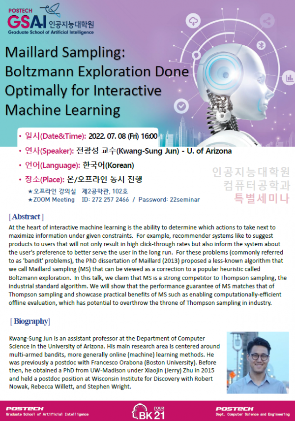[인공지능대학원] 특별세미나 개최 안내: 전광성 교수 (U. of Arizona) _ 7/8(금),...