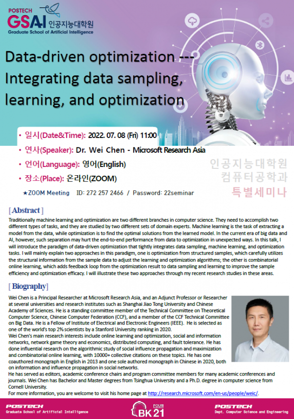 [인공지능대학원] 특별세미나 개최 안내: Dr. Wei Chen (Microsoft Research Asia)...