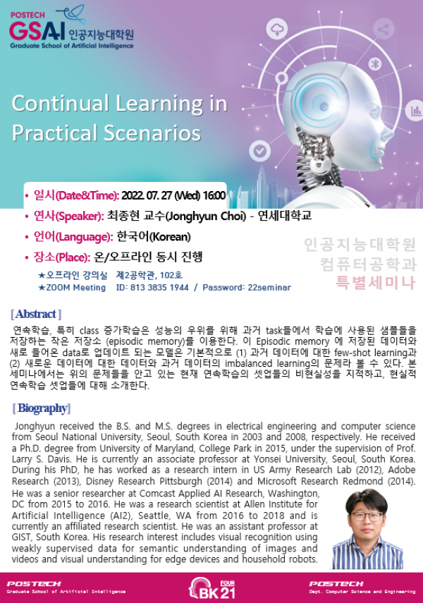 [인공지능대학원] 특별세미나 개최 안내: 최종현 교수 (연세대) _ 7/27(수), 오후 ...