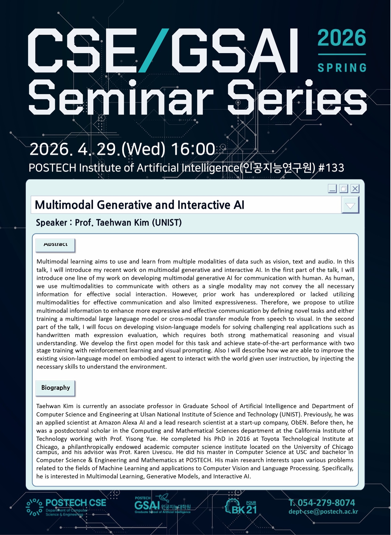 ▣ 장소(Venue) : 인공지능연구원 133호(PIAI #133)