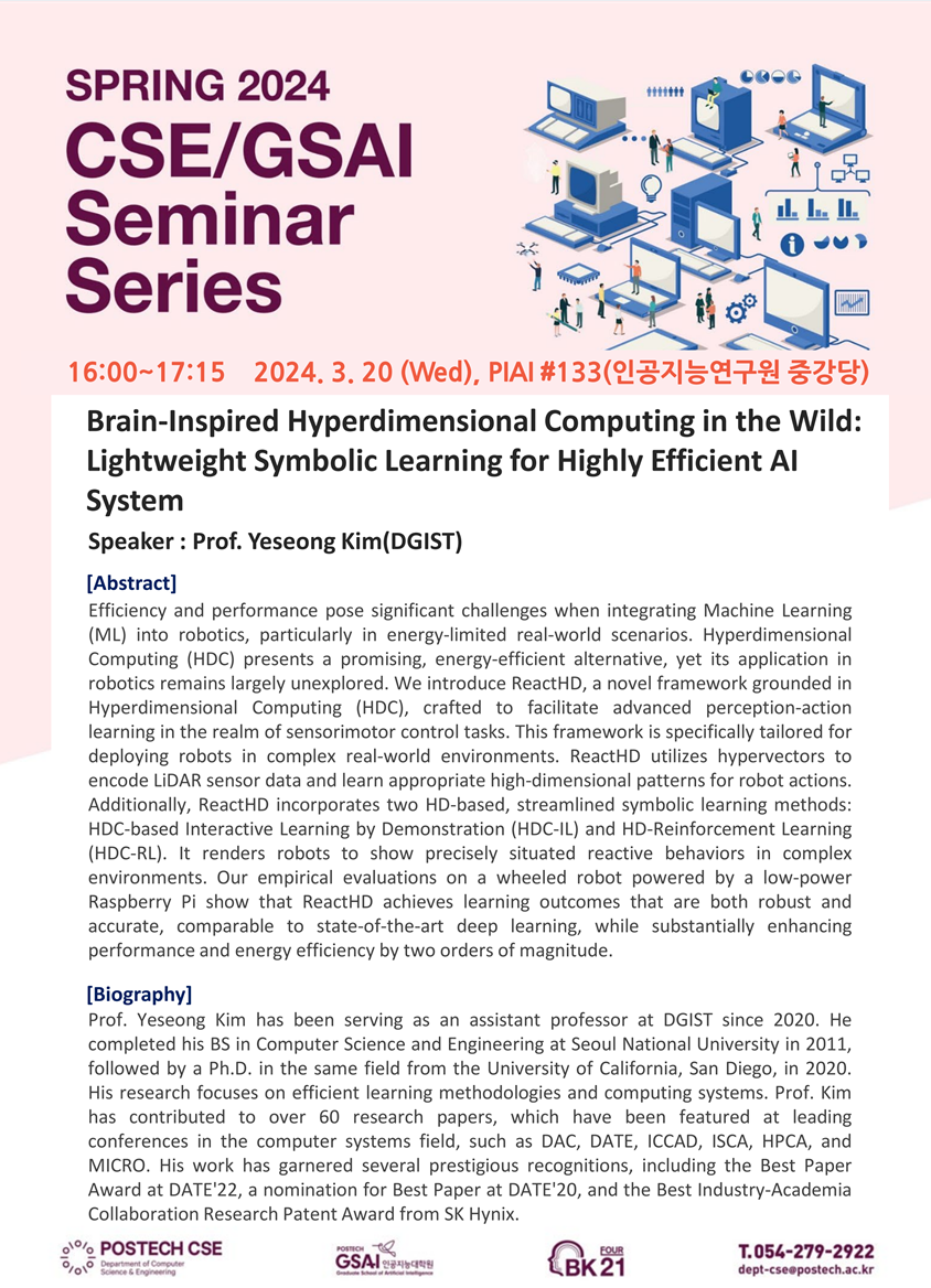 | 3/20(수) 4pm 2024-1학기 CSE/GSAI 정기 Seminar 안내_김예성 교수(DGIST) | ||
