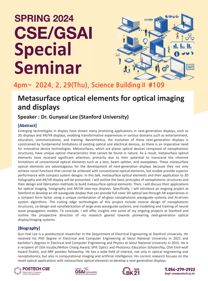 | 2/29(목) 4pm 2024-1학기 CSE/GSAI Special Seminar 안내_이건열 박사(Stanford University) | ||