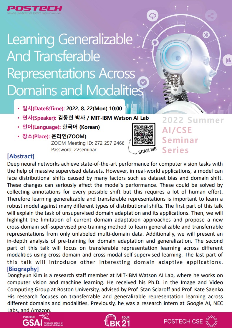 | [인공지능대학원] 2022 Summer AI / CSE Seminar Series : 7) 8/22, 김동현 박사(MIT-IBM Watson AI Lab) | ||