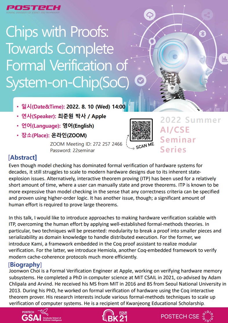 | [인공지능대학원] 2022 Summer AI / CSE Seminar Series : 3) 8/10, 최준원 박사 (Apple) | ||