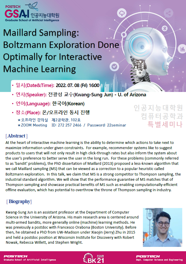 | [인공지능대학원] 특별세미나 개최 안내: 전광성 교수 (U. of Arizona) _ 7/8(금), 오후 4시, 온/오프라인 동시 진행 | ||