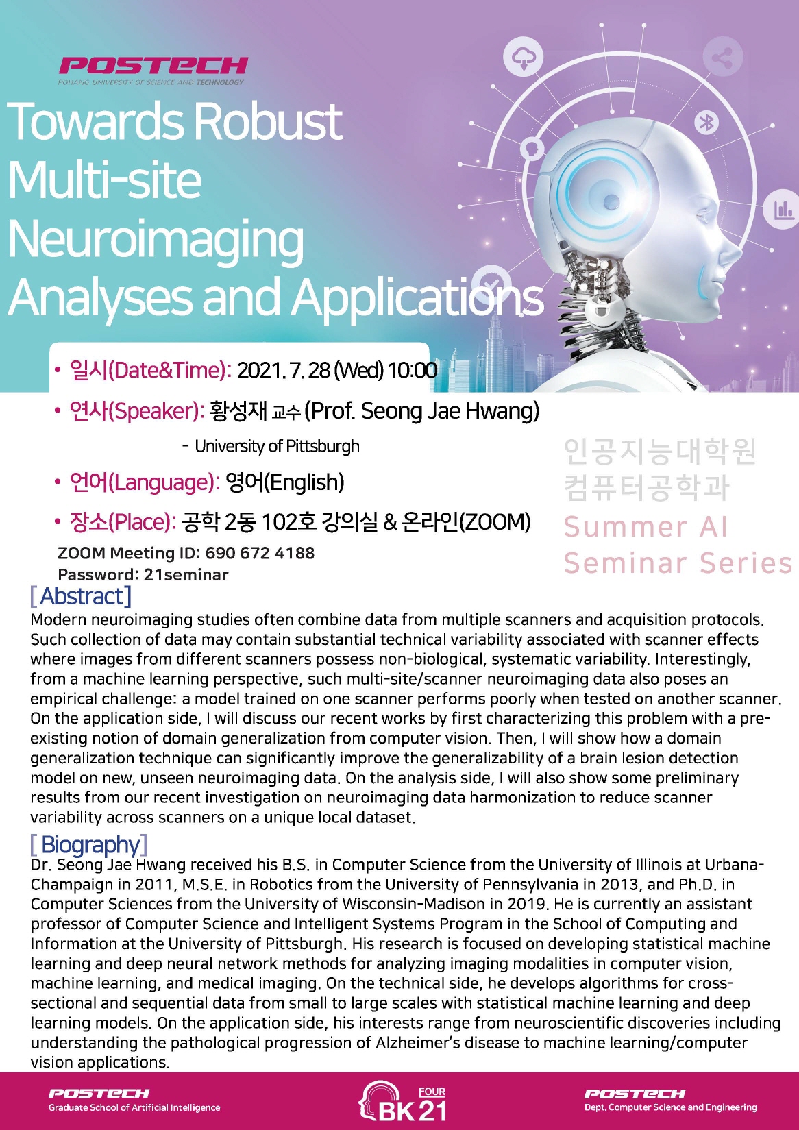 | [인공지능대학원/컴퓨터공학과] Summer AI Seminar Series 개최 (황성재 교수/University of Pittsburgh)_7/28(수) 10:00 | ||