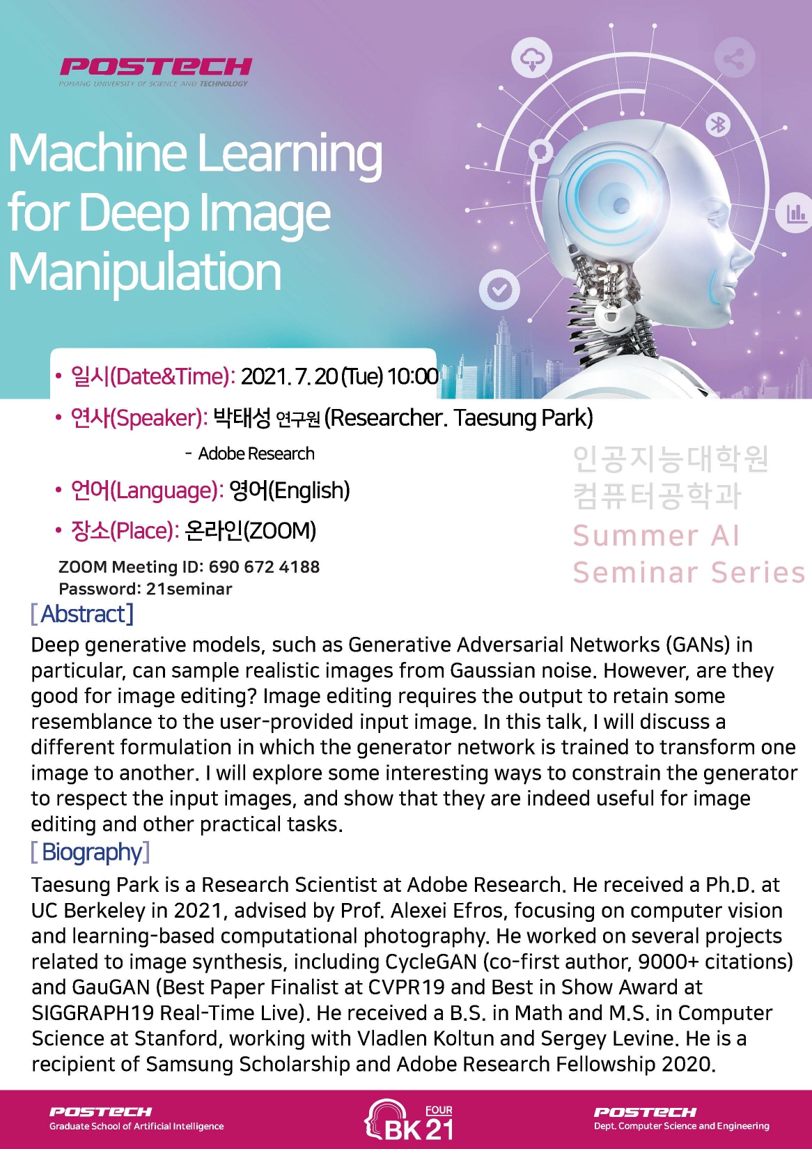 | [인공지능대학원/컴퓨터공학과] Summer AI Seminar Series 개최 (박태성 연구원/Adobe Research)_7/20(화) 10:00 | ||
