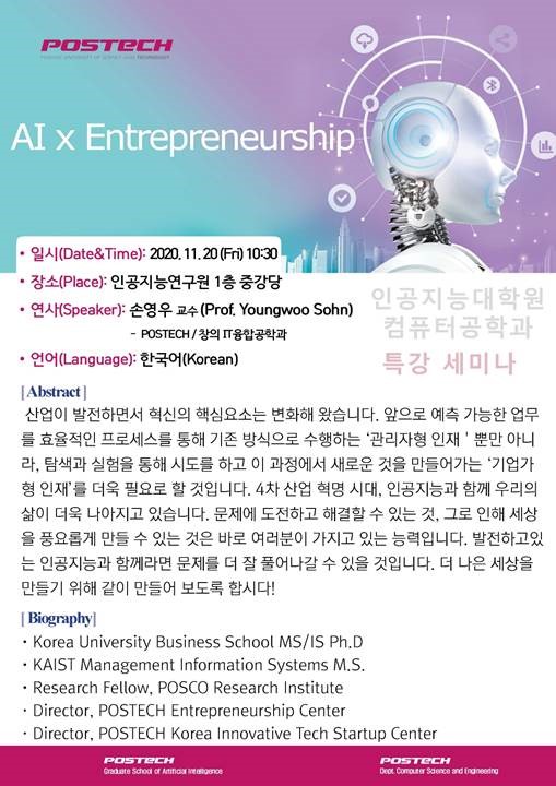 인공지능대학원/컴퓨터공학과에서는 ‘기업가정신’을 주제로 특강 세미나를 개최하고자 하오니