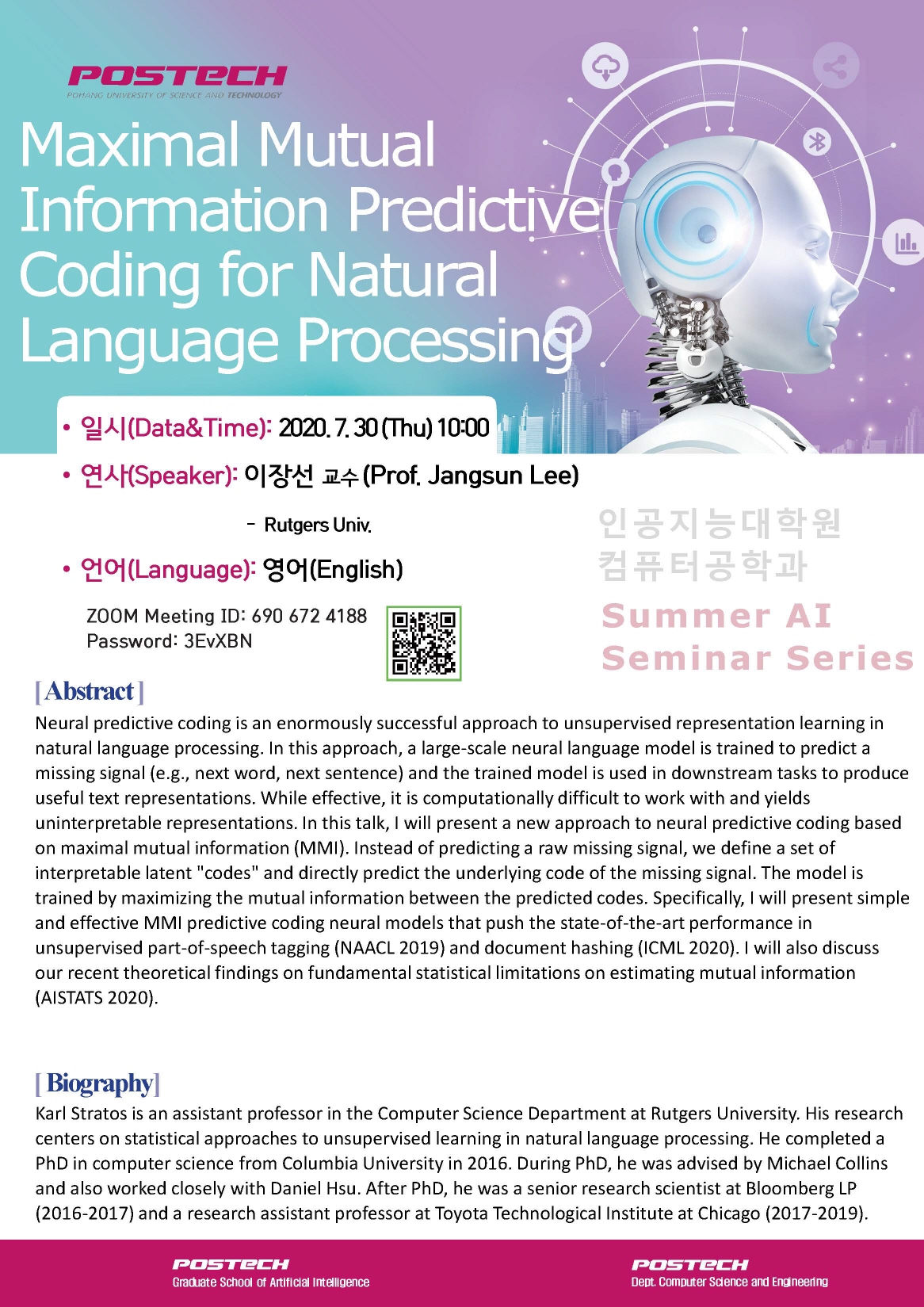 Summer AI Seminar Series를 온라인으로 개최하고자 하오니 많은 관심과 참여 바랍니다.