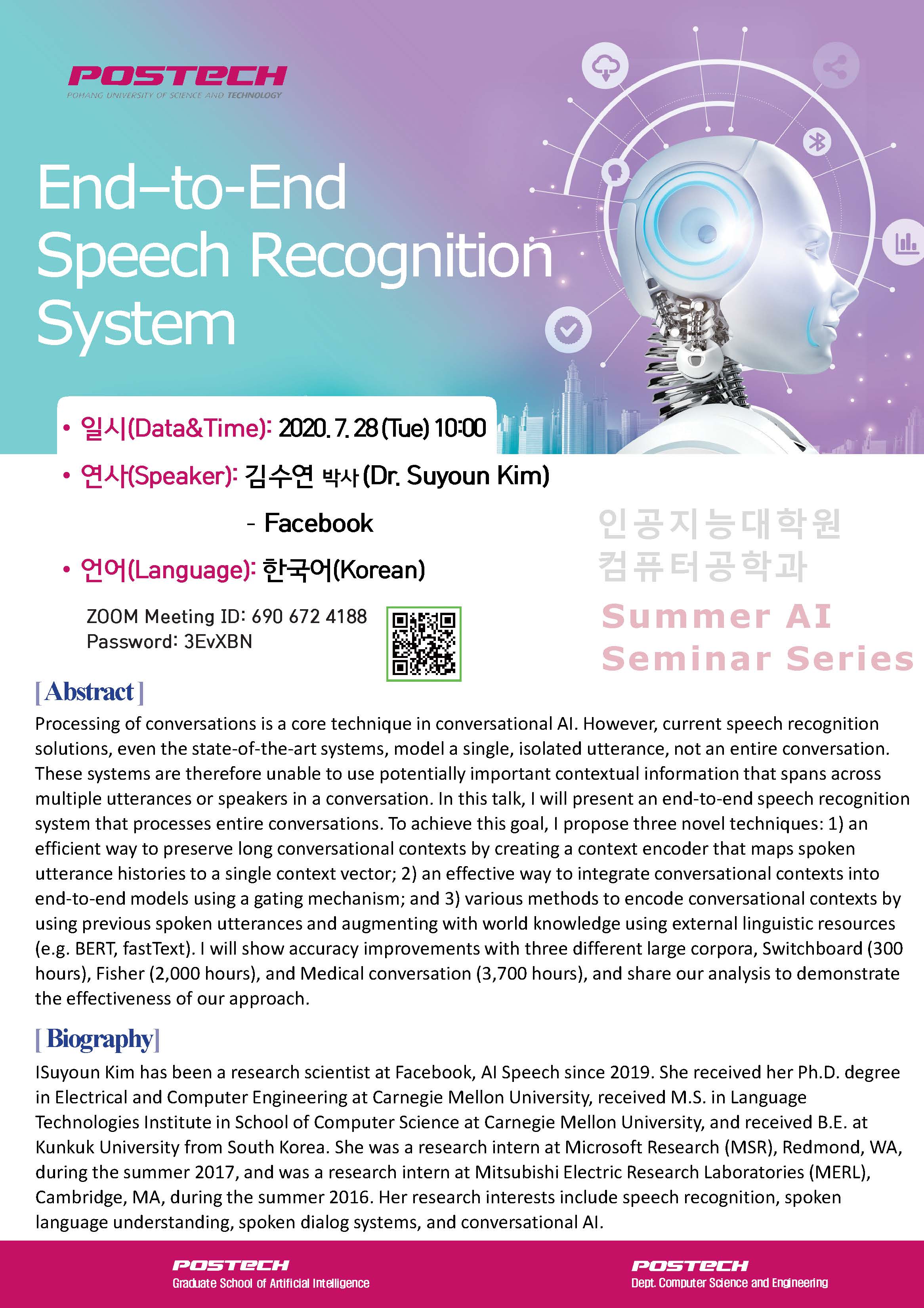 | [인공지능대학원/컴퓨터공학과] Summer AI Seminar Series 세미나 안내(김수연 박사/Facebook)_7/28(화) 10:00 | ||